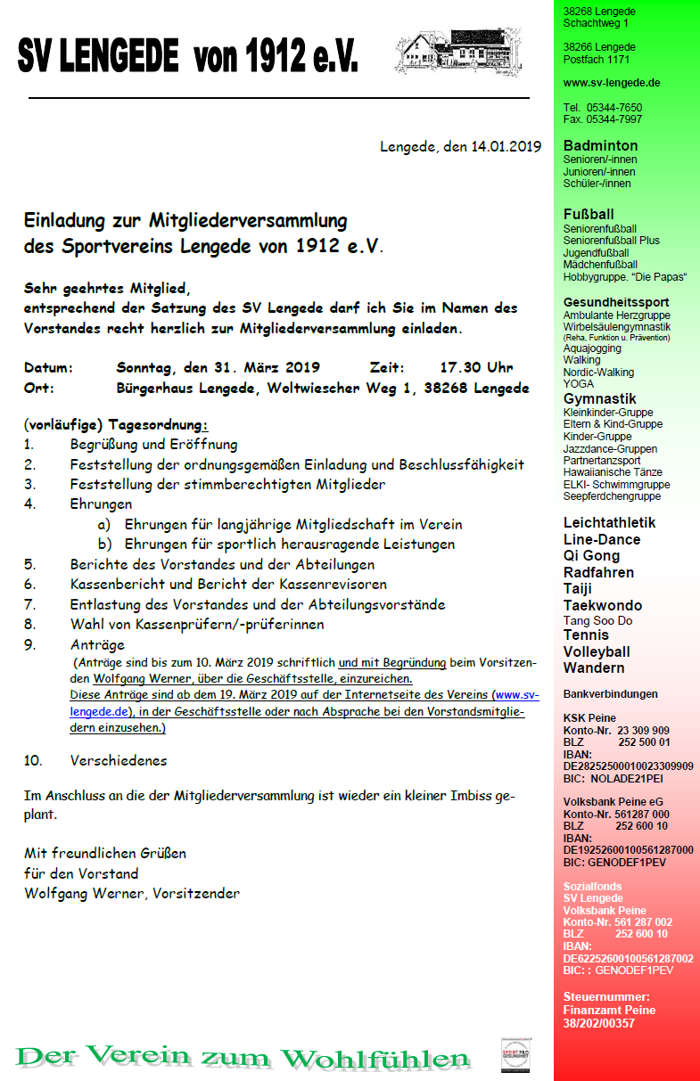 Einladung zur Mitgliederversammlung des Sportvereins Lengede von 1912 e.V.