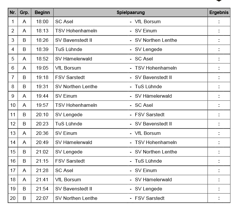 In den Gruppen „BOYA Autozentrum“ & „REWE“ spielen unter anderem Landesligist SV Lengede, die Bezirksligisten SV Einum und TSV Hohenhameln und Kreisliga-Spitzenreiter SV Bavenstedt II. Aber auch die benachbarten Klubs aus Asel, Borsum und Lühnde sind dabei. Das Eröffnungsspiel am Freitag bestreiten um 18Uhr die Kreisligisten SC Asel und VFL Borsum. Die Viertelfinalspiele sind für 22:20Uhr und 22:34Uhr angesetzt.
