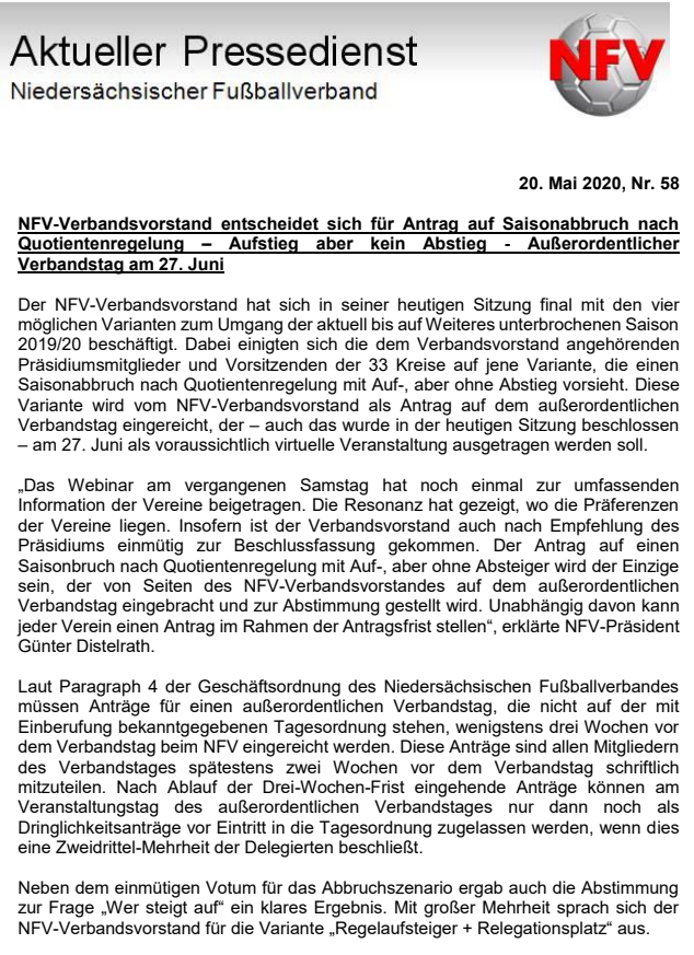 NFV-Verbandsvorstand entscheidet sich für Antrag auf Saisonabbruch nach Quotientenregelung