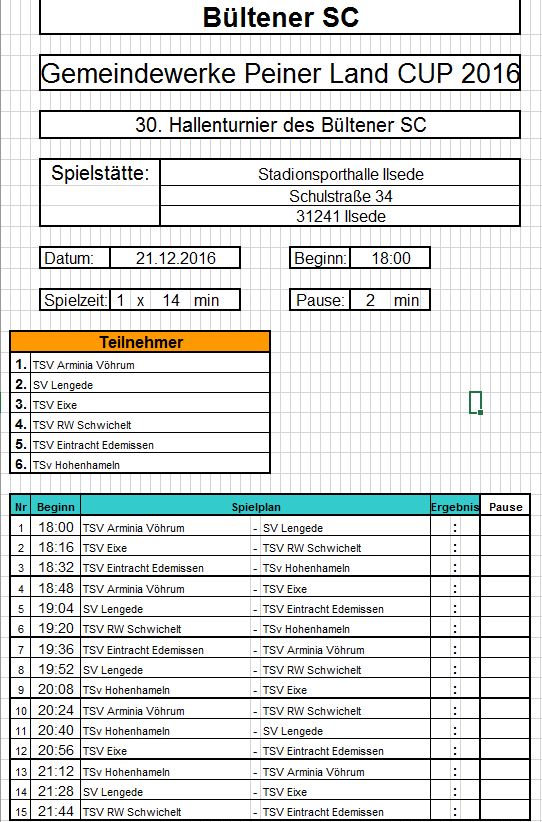 Fußball: Gemeindewerke Peiner Land CUP 2016 – 30. Hallenturnier des Bültener SC. Der SV Lengede in der Vorrunde am 21.12.2016 ab 18 Uhr 12. Dezember 2016 svladmin 1. Herren, Fußball