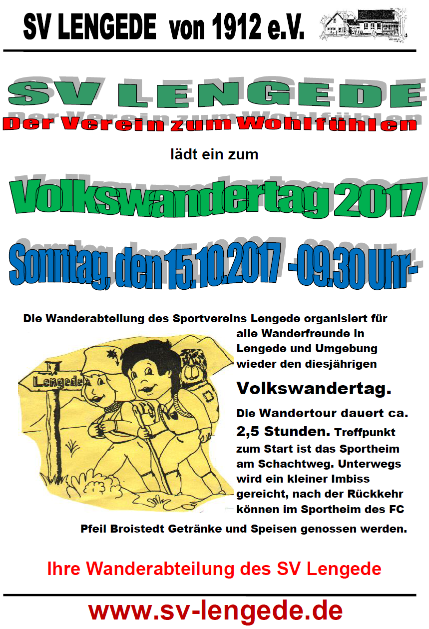 Einladung des SV Lengede zum Volkswandertag 2017 5. Oktober 2017 svladmin Verein Ein Klick auf das Bild öffnet das Original Dokument im PDF Format