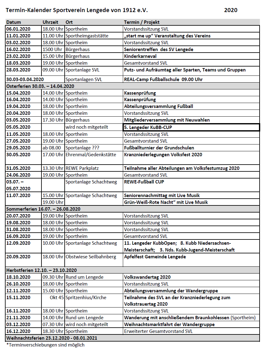 Termin-Kalender Sportverein Lengede von 1912 e.V. 2020