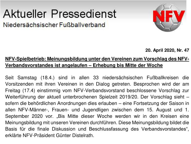 NFV-Spielbetrieb: Meinungsbildung unter den Vereinen zum Vorschlag des NFV Verbandsvorstandes ist angelaufen – Erhebung bis Mitte der Woche 20. April 2020 svladmin Fußball