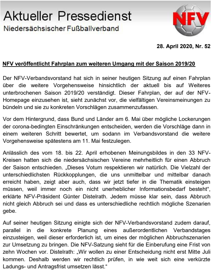 NFV veröffentlicht Fahrplan zum weiteren Umgang mit der Saison 2019/20 29. April 2020 svladmin Fußball